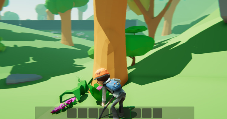 The character can use two tools for now : ax and shovel, which is related to two different materials. Then crafting system can transform the materials into new tools.